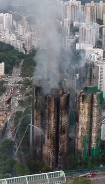 - The video shows aerial views of the damaged high-rise buildings, featuring green scaffolding, smoke, and firefighting efforts with water sprays; the fire is noted as one of Hong Kong's deadliest disasters.