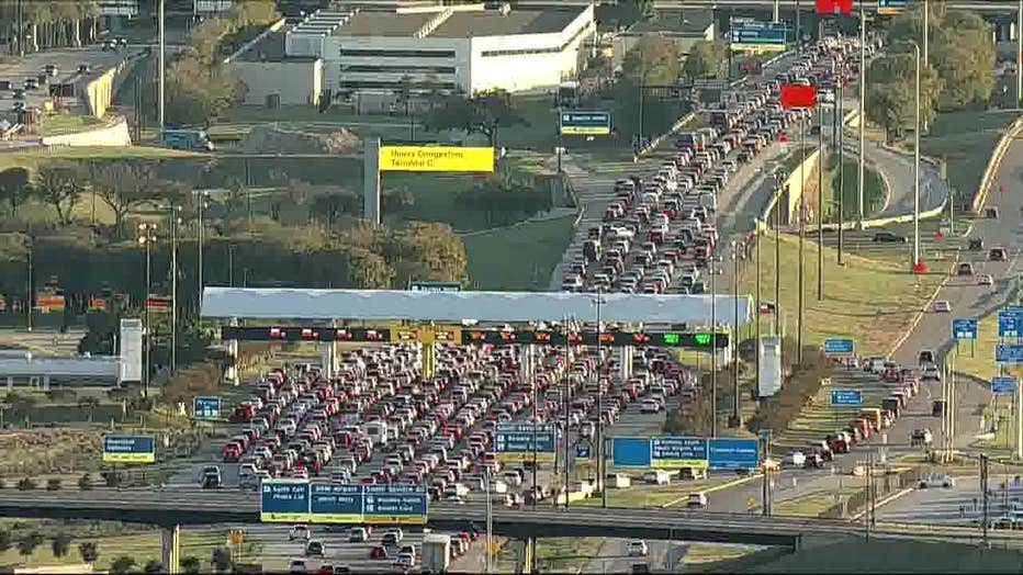 Images from the SKY 4 helicopter showed heavy traffic as people arrived at DFW Airport's north entrance at 5 p.m. on the day before Thanksgiving.